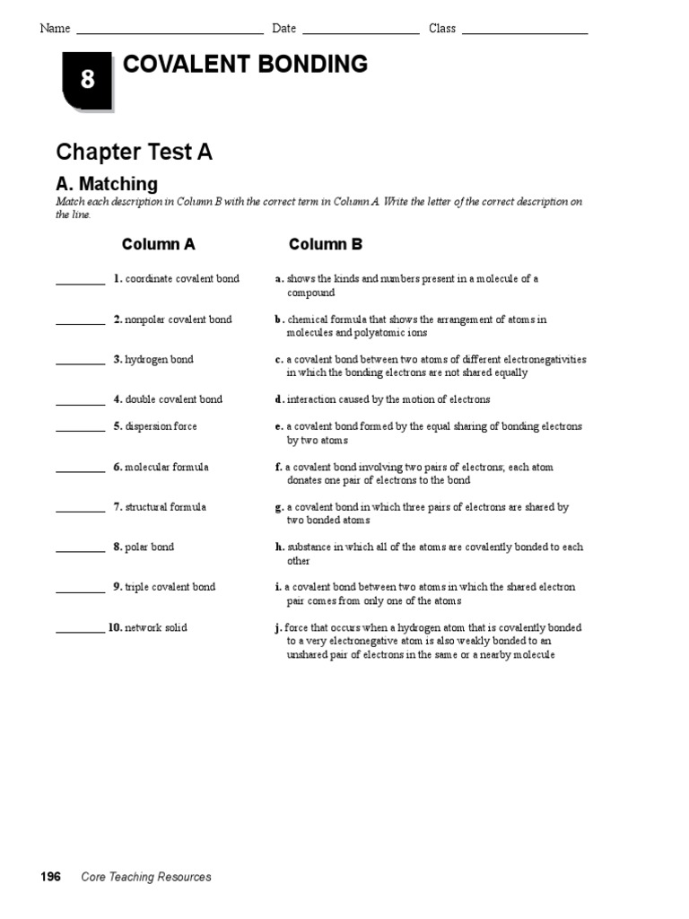 What would the back and forth movement of the ball represent? Science lesson plan on chemical bonding, covalent bond, ionic bond, and molecular bonding. If there are no metal atoms around to give them. Learn covalent bonding mcqs, chemical bonding quiz questions and answers for admission and merit scholarships test. Gcse activity and worksheet that uses models to compare ionic and covalent bonding. The answer is a covalent bond. Chapter 2 chemical principles bonding covalent bonding. 1 chemistry chapter 8 covalent bonding name date covalent bonds formed between. Answers to explain (analysis), part 1: Quickly memorize the terms, phrases and chapter 8: This content can also be downloaded as a pdf file. Once you find your worksheet. What does the vespr theory determine?