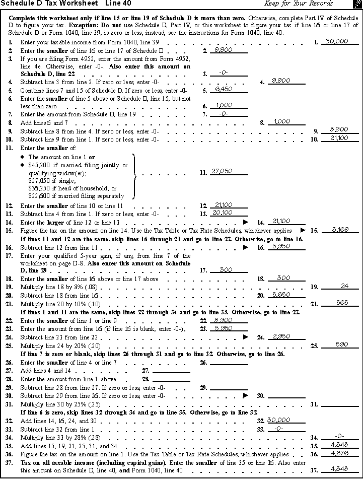 Complete this worksheet only if line 18 or line 19 of schedule d is more than zero and lines 15 and 16 of schedule d are gains. Worksheet will open in a new window. Otherwise, complete the qualified dividends and capital gain tax worksheet in the instructions for form 1040, line 44 (or in the instructions for form 1040nr, line 42) to figure your tax. To view the tax calculation on the schedule d tax worksheet, which will show the calculation of the tax which flows to form 1040 u.s. Tax form 1040, schedule d fill in and calculate online.